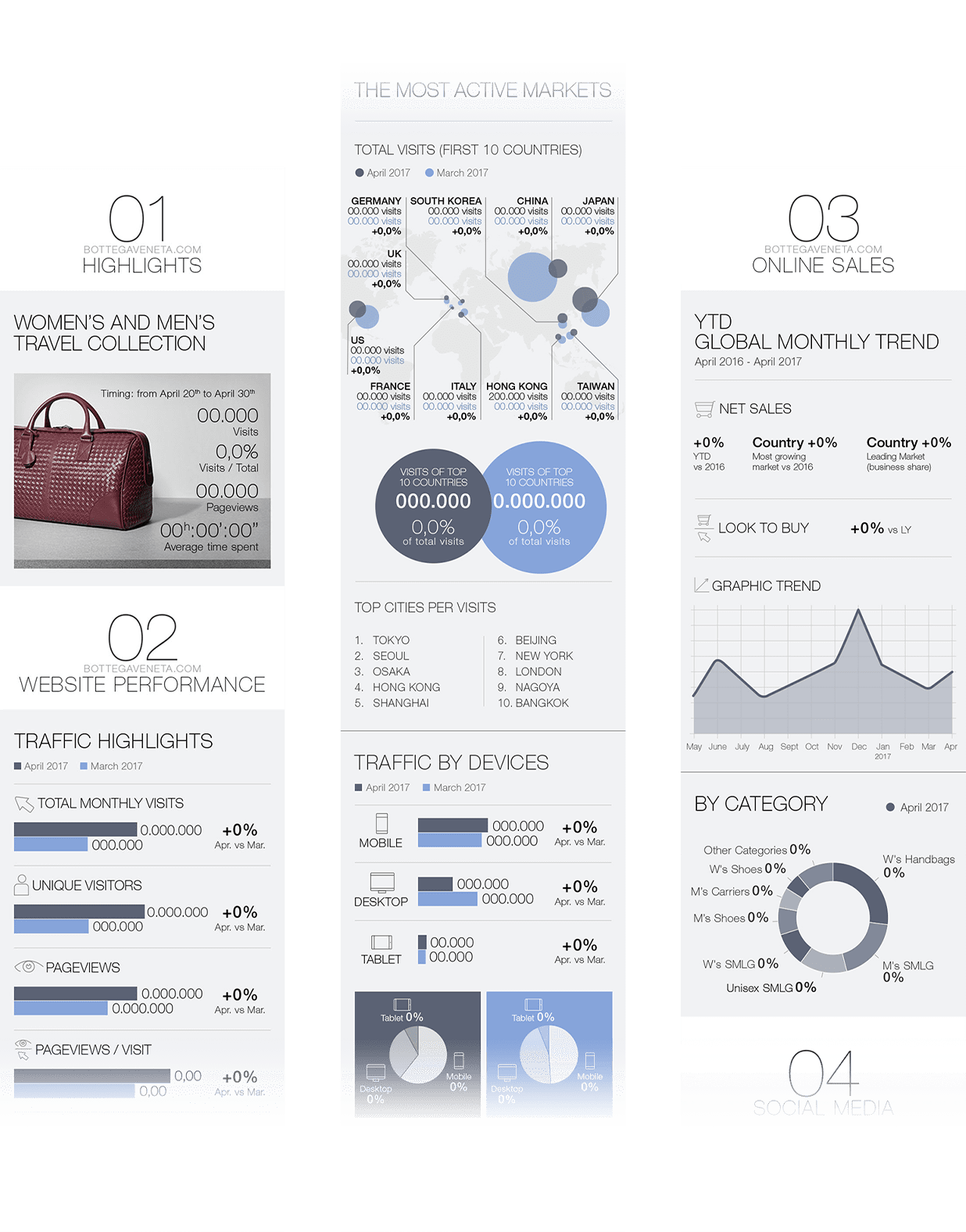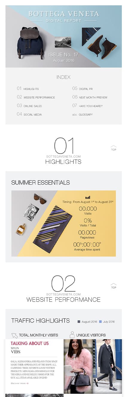Dands ha progettato e sviluppato per l’esclusivo brand di accessori del Gruppo Kering uno strumento di reportistica interna finalizzato alla divulgazione e valorizzazione delle attività del comparto Digital Communication. La newsletter, destinata al management aziendale e al retail ed inviata mensilmente, ha l’obiettivo di fornire una panoramica inclusiva di tutte le attività e contenuti digital diffusi dal brand mese per mese, con un focus su dati e performance (e-shop, digital marketing, social media). La struttura lineare a blocchi di contenuto, lo studio di un visual ad hoc, l’alternanza di immagini, testi e infografiche, forniscono una chiave di lettura immediata funzionale a orientare il business in un’ottica cross-channel.